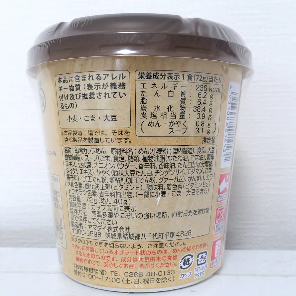 めん(小麦粉(国内製造)、食塩、大豆食物繊維)、スープ(ごま、食塩、糖類、植物油脂(なたね油、ごま油)、酵母エキス、豆板醤、オニオンパウダー、香辛料、香味油、たん白加水分解物、シイタケエキス)、かやく(粒状大豆たん白、チンゲンサイ、エダマメ、ごま、香辛料)/加工でん粉、増粘剤(加工でん粉、グァーガム)、かんすい、カラメル色素、酸化防止剤(ビタミンE)、酸味料、着色料(ビタミンB2)、トウガラシ色素、香辛料抽出物、(一部に小麦・ごま・大豆を含む)
