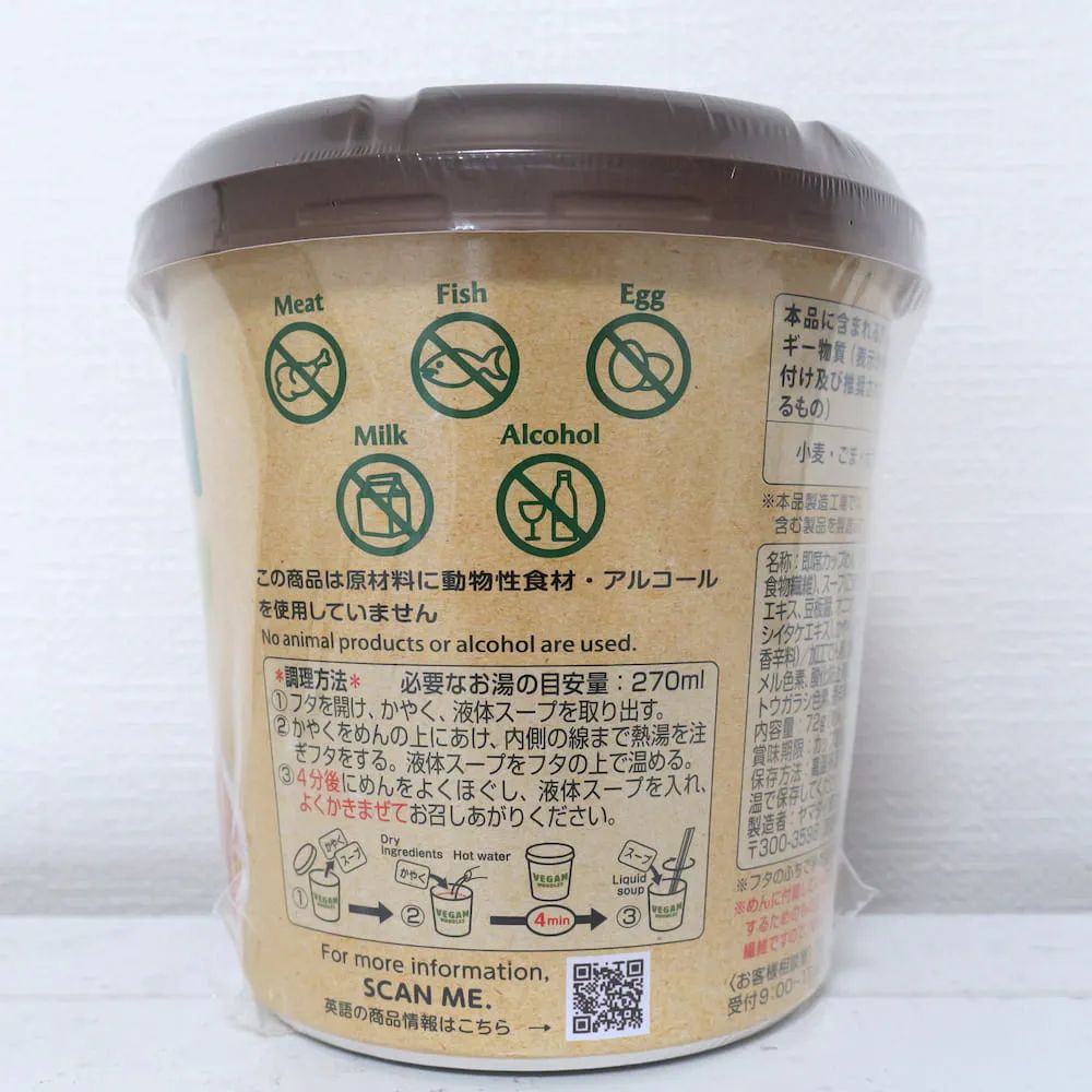 調理時間5分 材料 ヴィーガンヌードル担担麺:1個 熱湯:270ml 作り方(1人前) ①ふたを開け、かやく、液体スープを取り出します ②かやくを麺の上にかけます ③内側の…